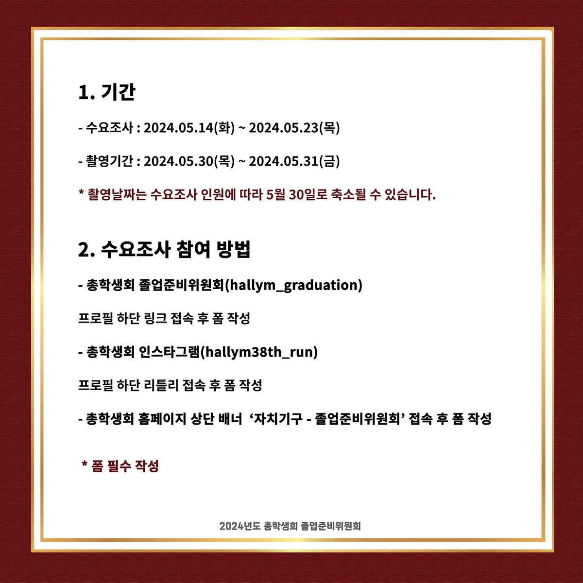 * 촬영날짜는 수요조사 인원에 따라 5월 30일 하루로 축소될 수 있습니다.