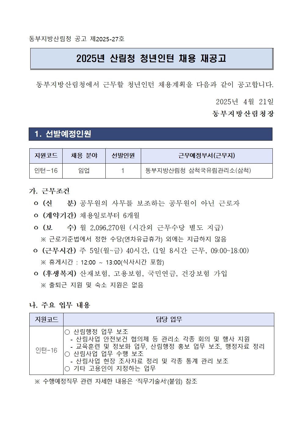 [동부청 공고 제2025-27호] 2025년도 산림청 청년인턴 채용 재공고.hwp