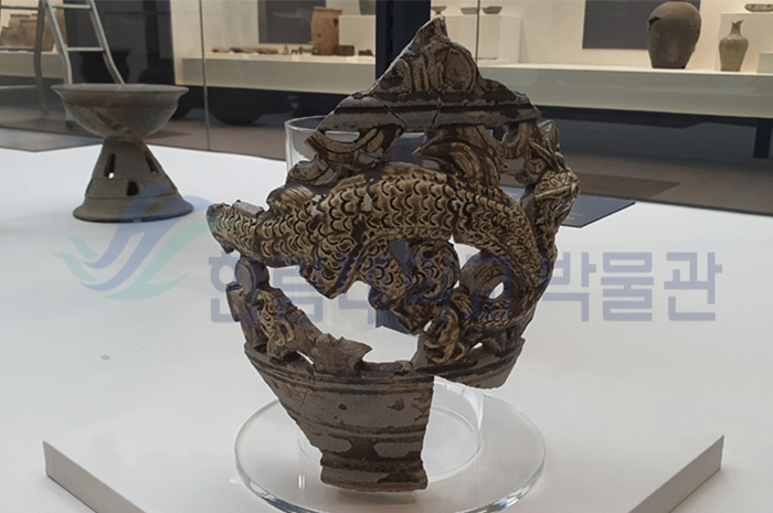 동체 중앙부가 최대 볼륨을 이루며, 상부와 하부로는 완만한 곡면을 이루며 좁아지는 형태로 저부는 살짝 벌어져 안정감 있게 마무리 되었습니다.  유색은 녹갈색이 주조를 이루는데,  용문 부분을 제외하고는 박락이 심한 편이며,  내면은 시유하되지 않았습니다. 모래와 잡물이 많이 포함된 청자토로  두텁게 만들었고 용문 부분은 백토를 덧붙여 장식하였습니다. 동체 중앙부에 장식된 용문을 제외한 바탕부분은 투각하였습니다.