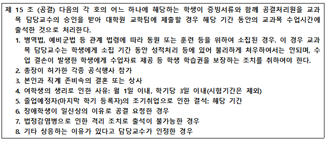 - 공결 허위신청(진단서 위조, 날짜 수정, 싸인 위조 등) 적발 시 학칙에 따라 엄중 처벌됨.